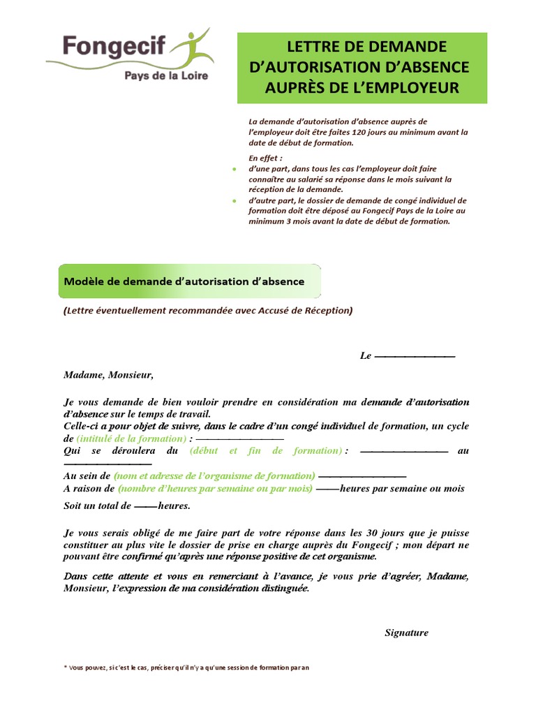 La lettre que vous adressez à votre employeur doit contenir pour transformer votre modèle de lettre « demande d'autorisation d'absence » en pdf, utilisez le logiciel de traitement de texte gratuit. 15 lut 2019 o godz. Exemple gratuit de lettre demande. Modèle de lettre d'autorisation d'absence.
