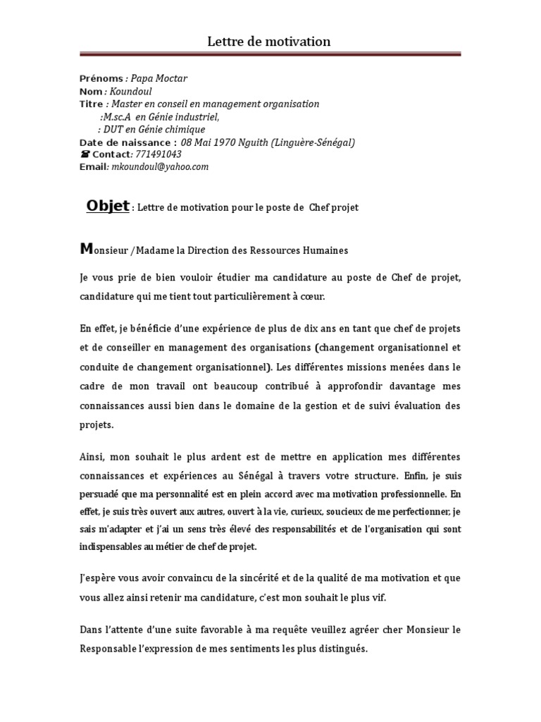 Lettre Motivation Chef De Projet. Retrouvez notre modèle de lettre de motivation pour le métier de chef de projet. Candidature au poste de chef de projet en communication.