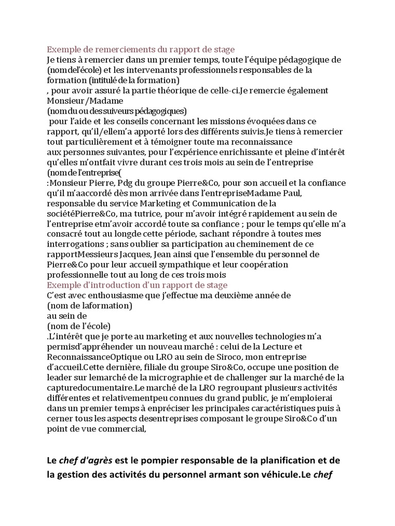 Les remerciements du rapport de stage sont toujours appréhendés par le stagiaire, qui a peur d'oublier un nom ou une personne. Afin de faciliter l'identification des informations à inclure dans la page de remerciements de rapport de stage, il est préférable de prendre comme modèle un exemple de remerciement de rapport de stage, qui se démarque par la qualité de la. Dans cet article, digischool te guide pour savoir comment rédiger les remerciements dans ton rapport de stage avec une méthodologie simple. Chaque situation est différente, il.